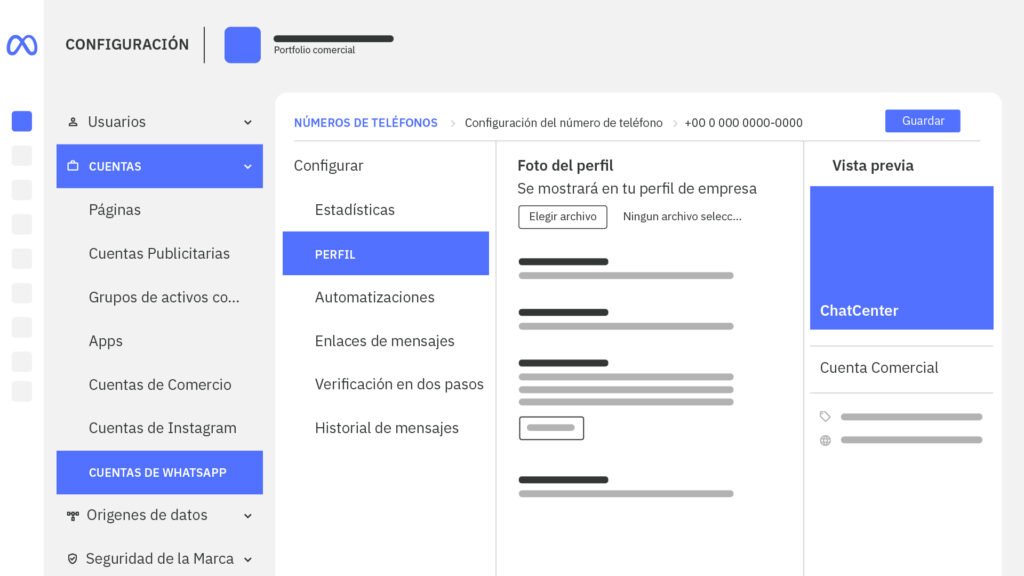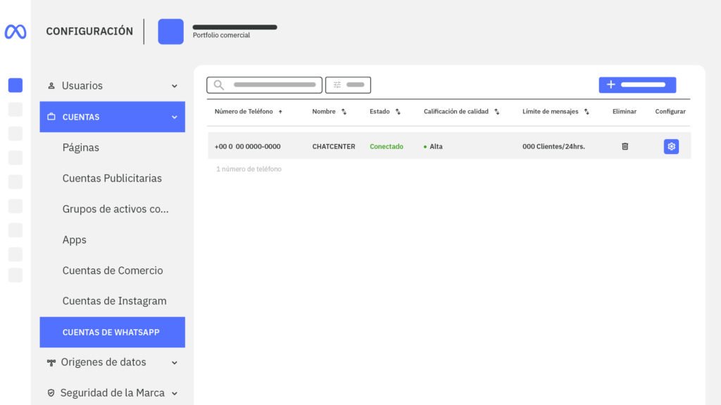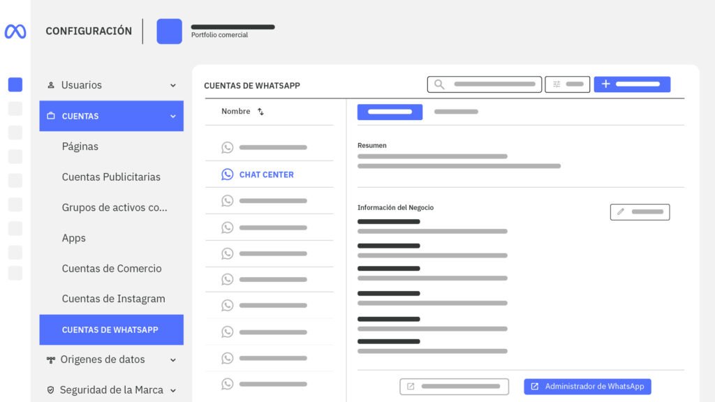 1. Haz clic en “Configuración” y luego en “Cuentas de WhatsApp”. Ahí elige la app de Empresa – ChateCommerce y después selecciónalo como “Administrador de WhatsApp”