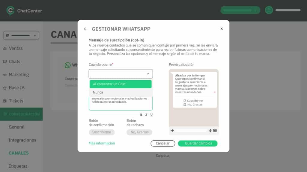 Al momento de configurarlo, se puede optar por no incluirlo o colocarlo al inicio de la conversación. Activarlo no implica que no podrás conversar, solo que no se podrán enviar campañas de marketing.