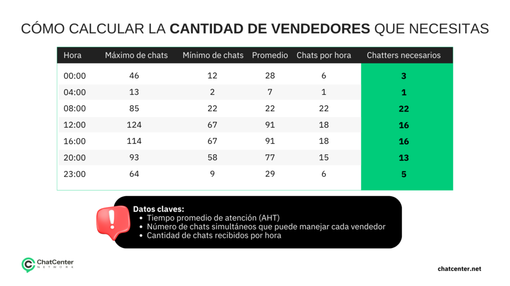 Un aspecto a definir es el número necesario de agentes es el tiempo promedio de atención por conversación siendo que, en estrategias de WhatsApp, cada vendedor puede gestionar varias conversaciones simultáneamente. Según María Cabrera, Gerente de Cuentas de Chat Center, un vendedor puede atender entre cinco y siete conversaciones a la vez en una hora. Este dato es clave para estimar cuántos vendedores serán necesarios según el volumen esperado de tráfico.