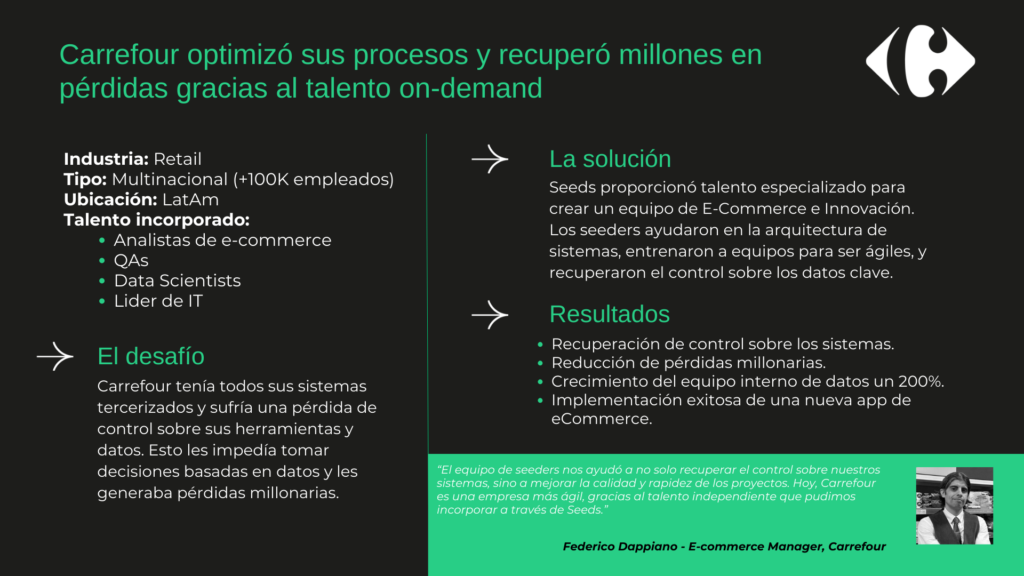 Tomemos un caso de éxito para visualizar de manera empírica cómo, una buena preparación de un equipo, optimiza procesos de e-commerce. Esto es lo que sucedió durante el último CyberMonday en Carrefour, quienes contaron con Seeds para enfrentar este desafío: