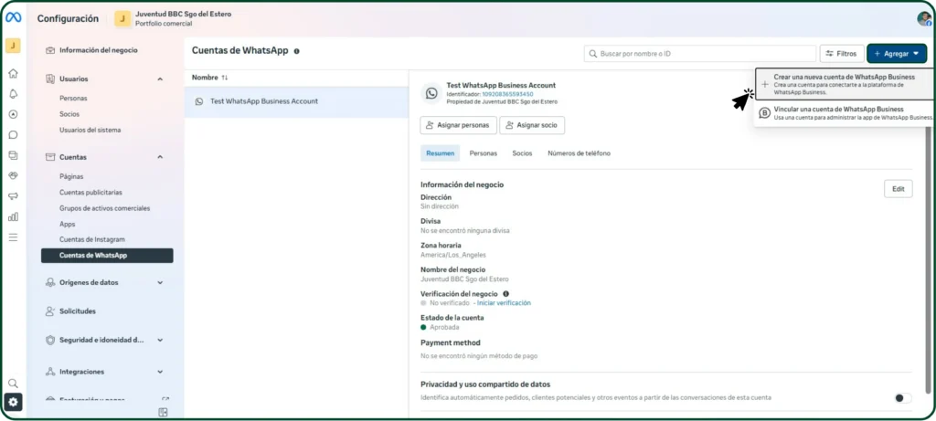 - Hacer clic en Agregar > Vincular una cuenta de WhatsApp Business
