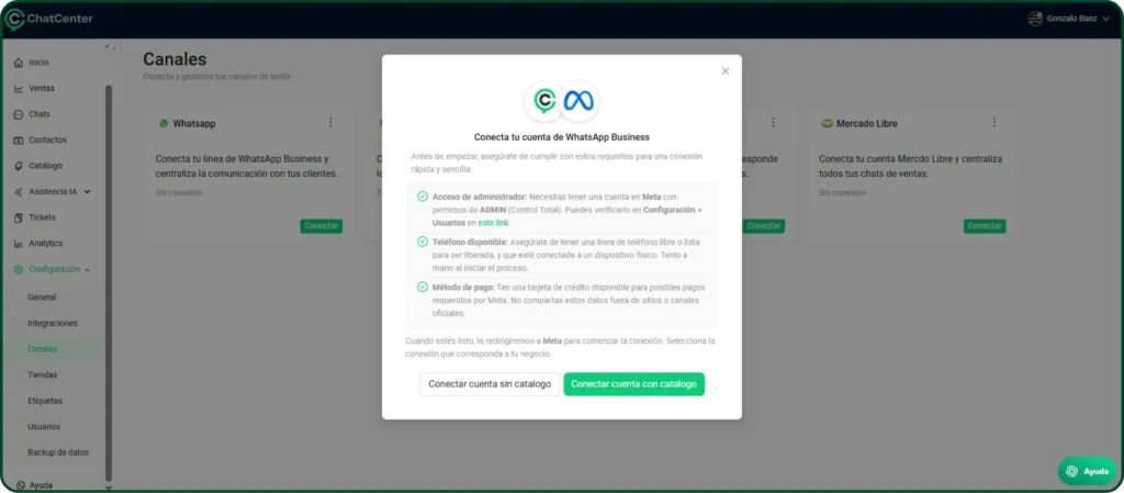 Requisitos para conectar WhatsApp Business a ChateCommerce