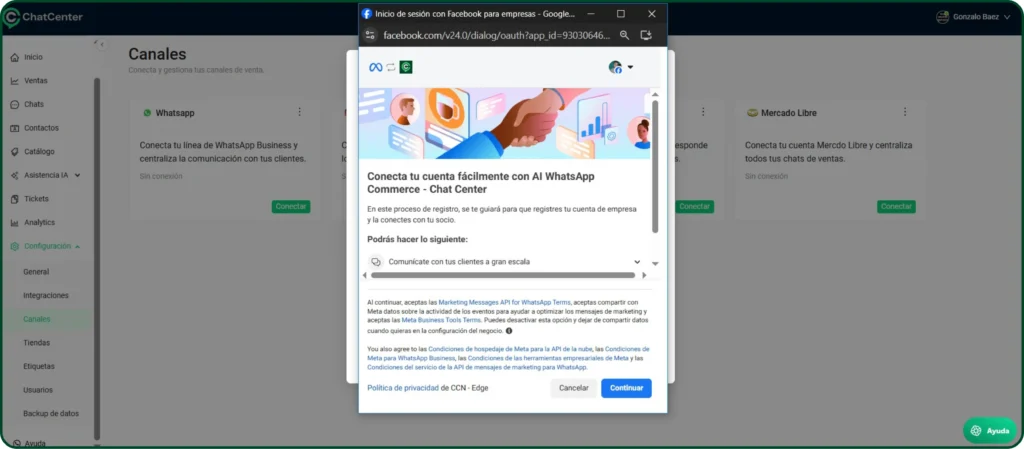 - En ChateCommerce, ir a Configuración > Canales > WhatsApp – Conectar